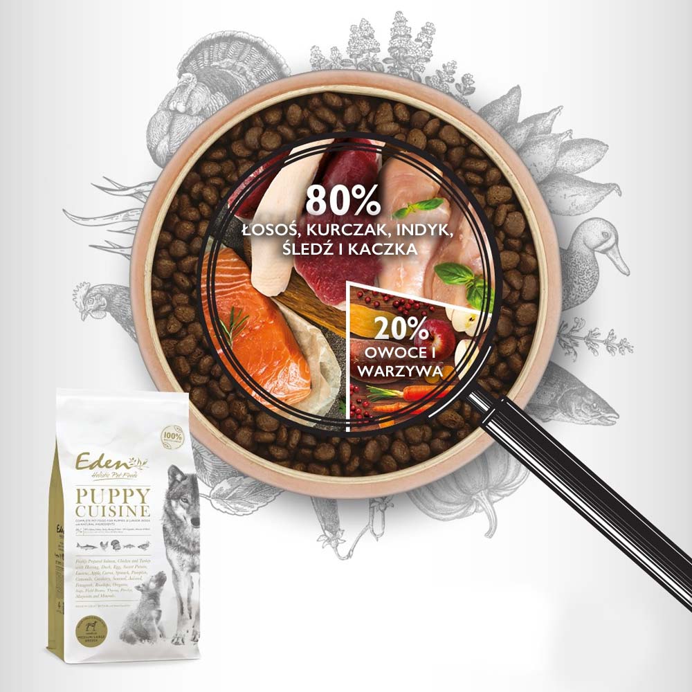 Karma sucha Eden Puppy Cuisine to 80% soczystego łososia szkockiego, soczystego kurczaka, kuszącego indyka, aromatycznego śledzia i wyśmienitej kaczki. 20% to warzywa, owoce, zioła i minerały.