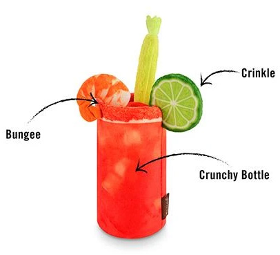 Buddy Mary od P.L.A.Y. to stylowa, piszcząco-szeleszcząca zabawka brunchowa z chrupiącym środkiem i bungee krewetką – idealna dla psów, które kochają zabawę z klasą!